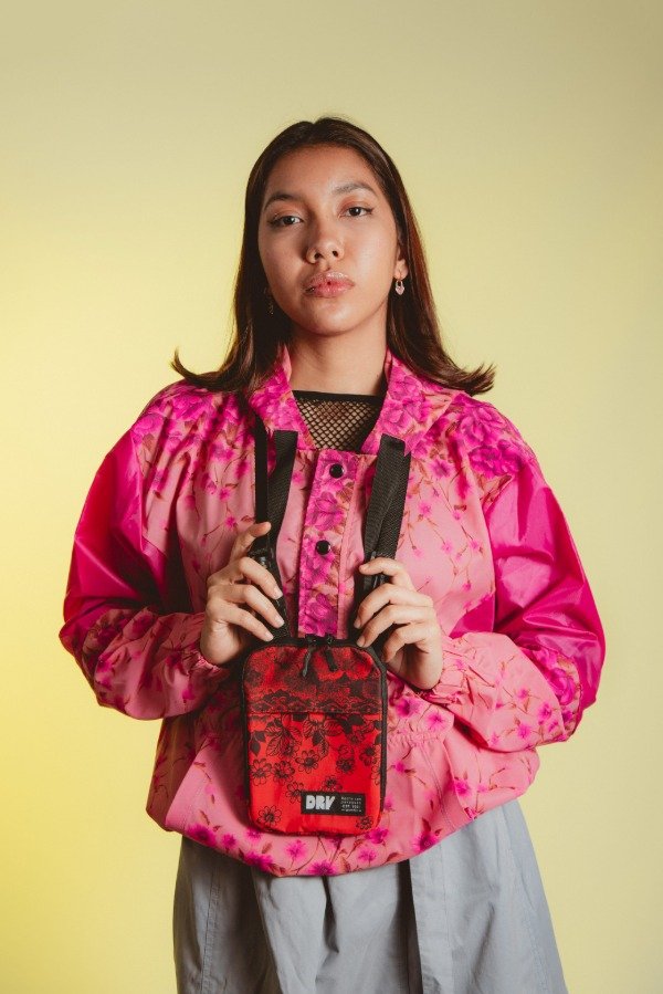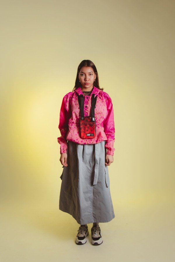 Buzo confeccionado con telas paraguas recuperados. Único e irrepetible, sin género.