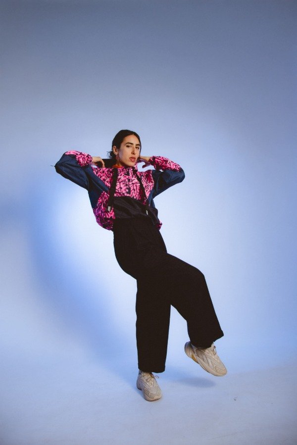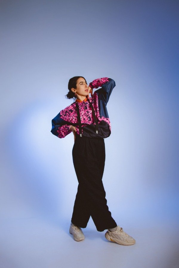 Buzo confeccionado con telas paraguas recuperados. Único e irrepetible, sin género.