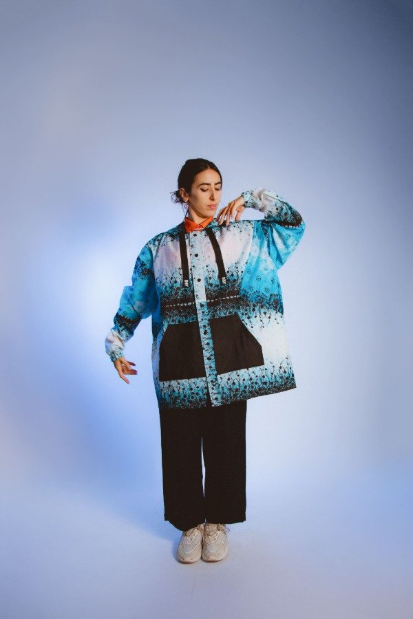 Campera hecha a mano con paraguas recuperados, única e irrepetible, sin género.